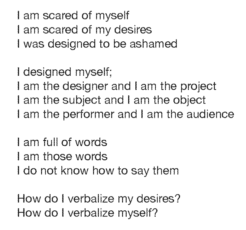 In order to reshape personal fears and shame of sexuality there needs to be a recontextualized way of dealing with the matter at hand. I am constantly choosing to be unavailable and distant, so I exploit my pain by making it accessible to myself and others in a reformatted version of its original form. Using text. Using clay. Using a knife. Using nail polish. Using my body.